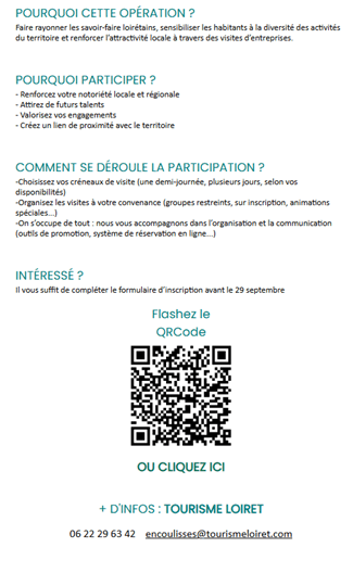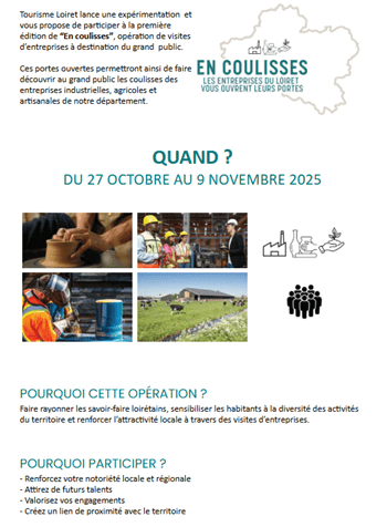 Tourisme Loiret lance la 1ʳᵉ édition d’« En coulisses », une opération de visites d’entreprises du 27 octobre au 9 novembre 2025.