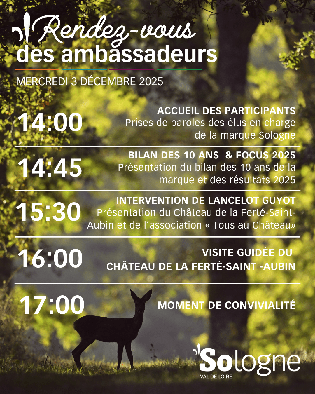 La marque Sologne donne rendez-vous à ses ambassadeurs le mercredi 3 décembre après-midi au Château de La Ferté-Saint-Aubin pour un Rendez-vous des Ambassadeurs exceptionnel. Cette année, seront célébrés les 10 ans de la marque Sologne, une étape marquante dans l’histoire de la destination et un moment fort à partager.